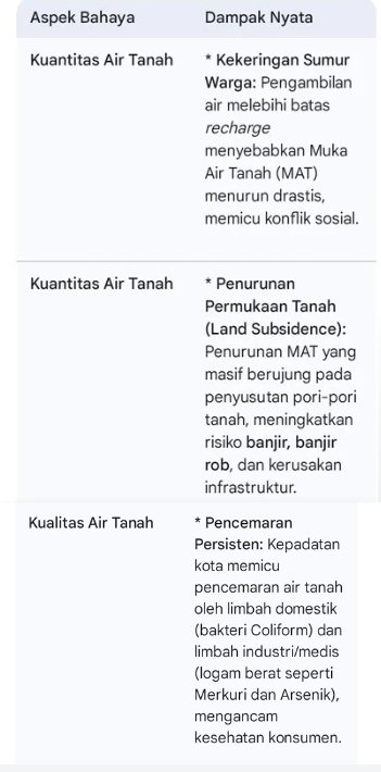 Tarmizi mengingatkan bahwa keberadaan perusahaan air minum yang bersumber dari air tanah di tengah perkotaan menunjukkan kerentanan tinggi dan dampak negatif signifikan yang harus dikelola secara serius. Kerentanan ini berfokus pada dua aspek utama: kuantitas (debit air) dan kualitas air tanah.