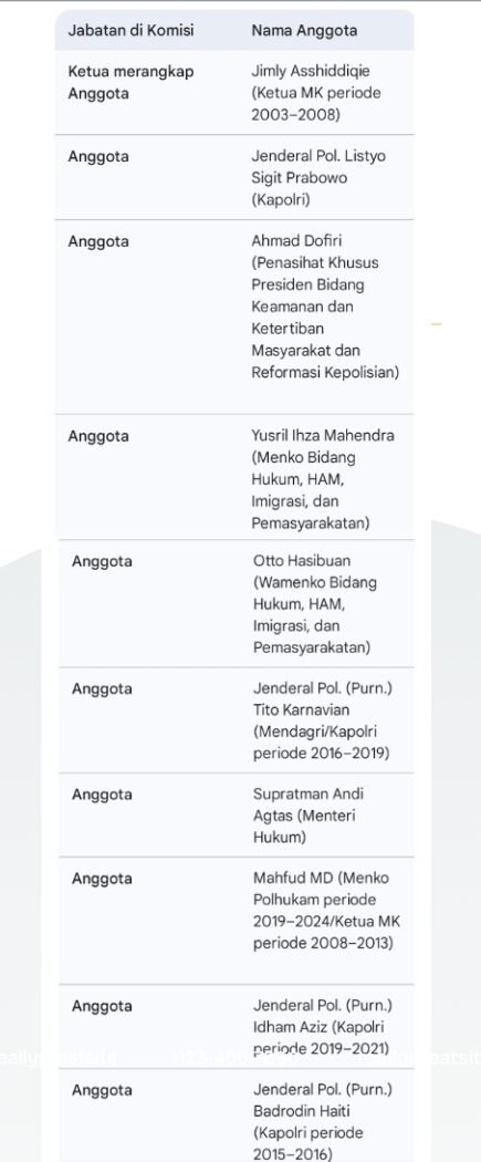 - Kolaborasi: Komisi juga akan bersinergi erat dengan tim internal yang telah dibentuk oleh Kapolri, yang berfokus pada perbaikan manajemen di lingkungan kepolisian.