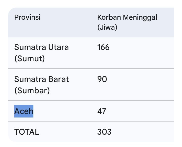 Korban jiwa di Sumut melonjak drastis dari 116 menjadi 166 orang meninggal dunia. Selain itu, 143 jiwa dilaporkan masih dalam pencarian.
