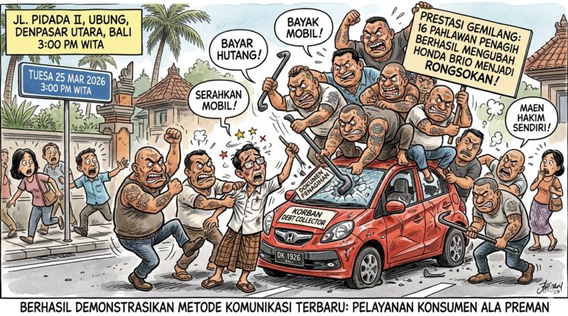 DENPASAR, BALI, JURNAL TIPIKOR – Rupanya, definisi “pelayanan konsumen” telah mengalami pergeseran paradigma yang cukup radikal di Bali. Pada Selasa (25/3/2026), sebanyak 16 pria dengan dedikasi tinggi yang berprofesi sebagai debt collector mendemonstrasikan metode “komunikasi persuasif” terbaru mereka di Jalan Pidada II, Ubung, Denpasar Utara.