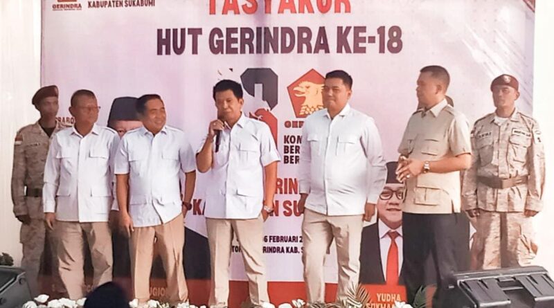 Sukabumi, jurnaltipikor.com/,- Ketua Dewan Pimpinan Cabang (DPC) Partai Gerindra Kabupaten Sukabumi, Tedi Setiadi, dalam acara Tasyakur HUT Gerindra ke-18 bmenyampaikan kepada seluruh jajaran kepengurusan, anggota, kader dan juga simpatisan di tingkat DPC dan PAC agar meningkatkan pengabdian kepada masyarakat dan perkuat soliditas.